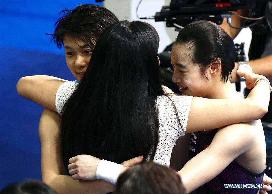 China's Shi Tingmao (L)/Chang Yani (R) celebrate with the Chinese diving team manager Zhou Jihong after winning gold in the women's 3m springboard synchronised final of Diving at the 17th FINA World Championships at Duna Arena in Budapest, Hungary on July 17, 2017. China's Shi Tingmao/Chang Yani won gold with 333.30 points. (Xinhua/Ding Xu)