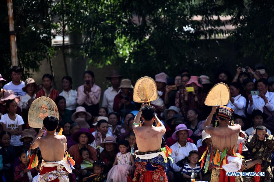 Young people perform dancing with backs and cheeks pierced with steel needles during a ritual ceremony in Tongren County of Huangnan Tibetan Autonomous Prefecture, northwest China's Qinghai Province, July 17, 2017. "Gathering of the sixth month" was a festival with a history of more than 1,400 years in the region. (Xinhua/Zhang Hongxiang)