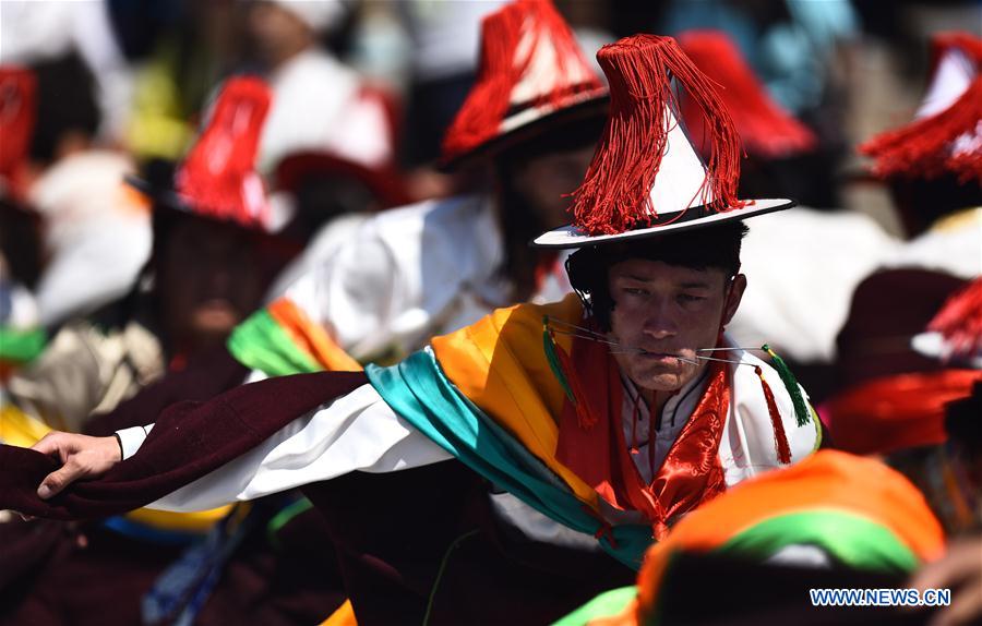 | A man dances with his cheeks pierced with steel needles during a ritual ceremony in Tongren County of Huangnan Tibetan Autonomous Prefecture, northwest China's Qinghai Province, July 17, 2017. "Gathering of the sixth month" was a festival with a history of more than 1,400 years in the region. (Xinhua/Zhang Hongxiang) |