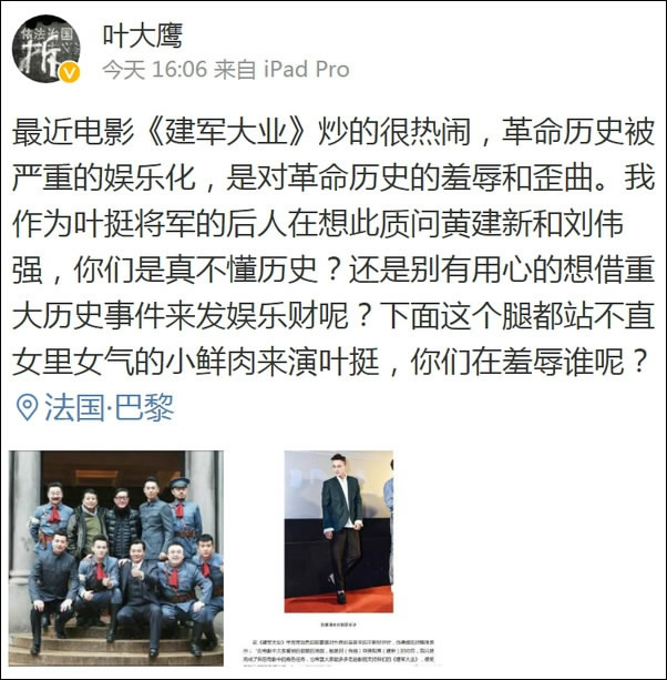 "As a descendant of General Ye Ting, I doubt that both the directors know about the history at all! It's more likely that they are making use of major historic events to make a big fortune!," Ye Daying, grandson of Ye Ting, also a well-known film director questioned on Twitter-like social platform Weibo on Tuesday.