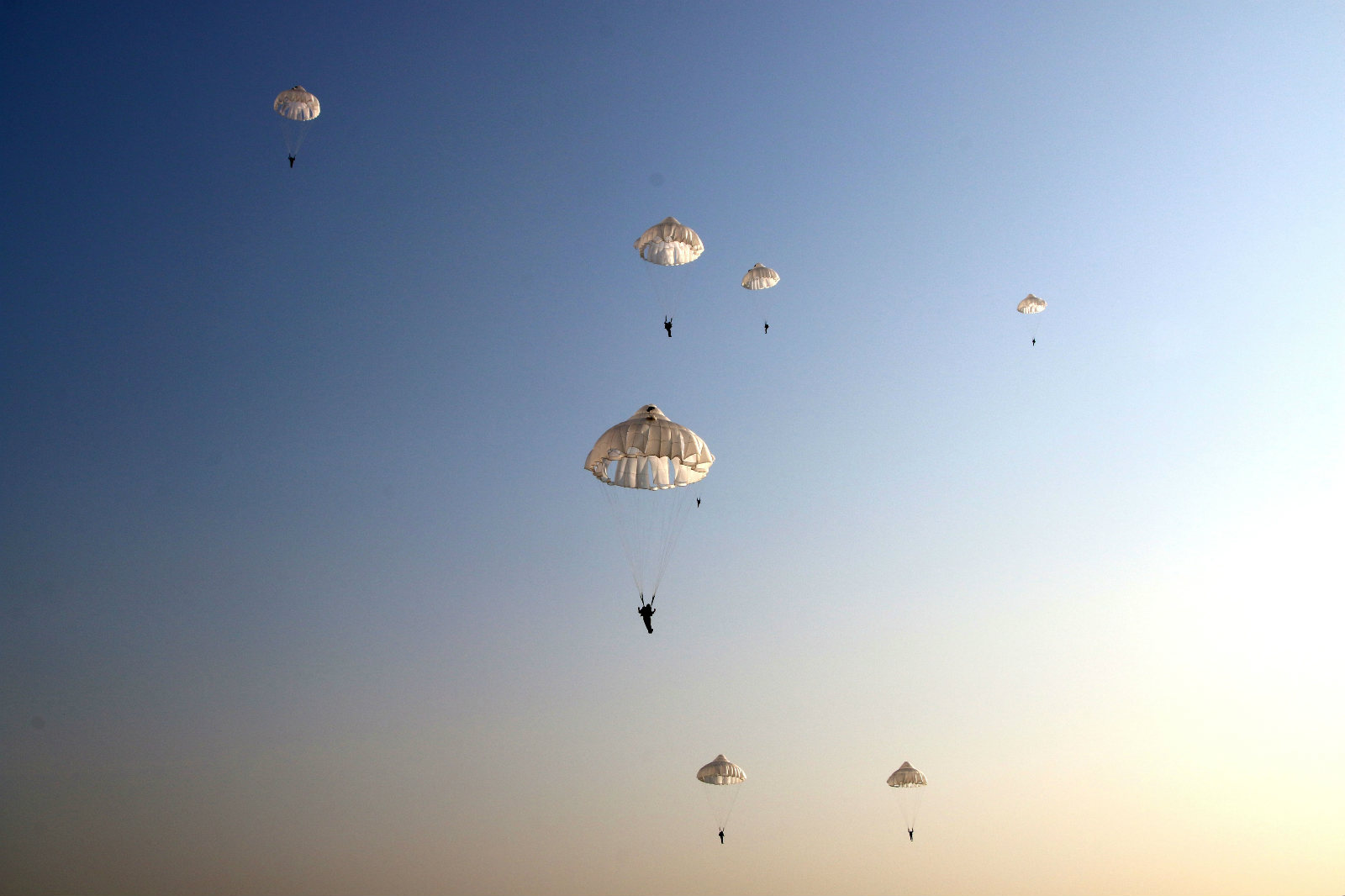 Foreign paratroopers descend to the ground with parachutes after jumping out of transport helicopters. Teams of paratroopers from different countries are in preparation for the Airborne Platoon event of the International Army Games (IAG) 2017 in central China's Hubei Province. (eng.chinamil.com.cn/Photo by Qi Yongqiang and Guo Mingming)