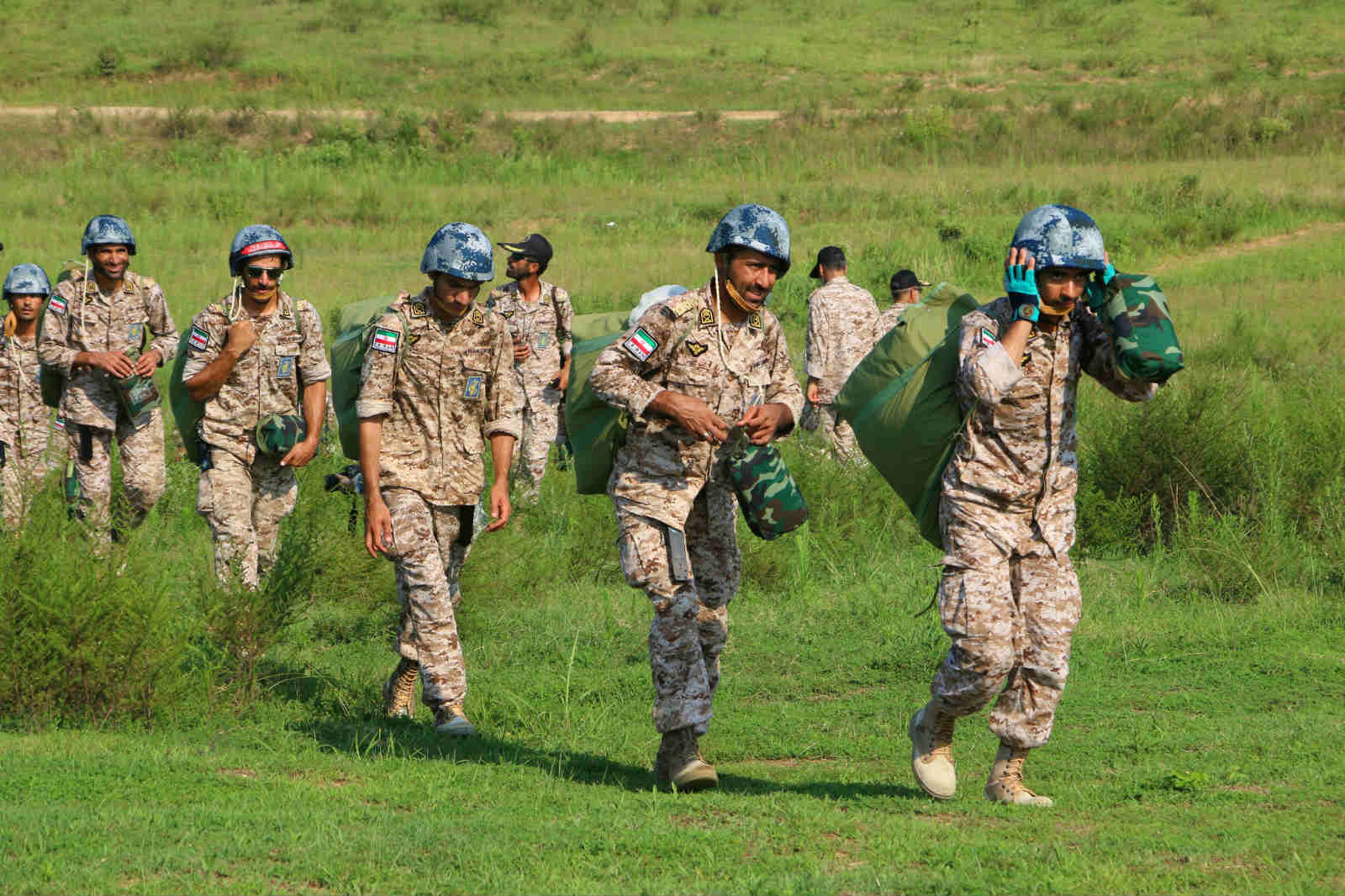 Iranian paratroopers walk off a drop zone after completing a parachute training exercise. Teams of paratroopers from different countries are in preparation for the Airborne Platoon event of the International Army Games (IAG) 2017 in central China's Hubei Province. (eng.chinamil.com.cn/Photo by Qi Yongqiang and Guo Mingming)
