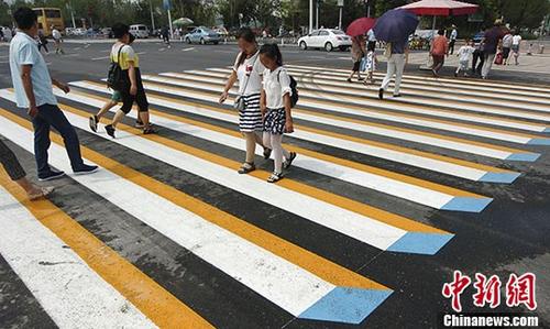 A new 3D zebra crossing is painted at a pedestrian crossing on a busy street in Tianjin in an effort to reduce traffic accidents. The visual trick is believed to be able to slow down drivers. (Chinanews.com)