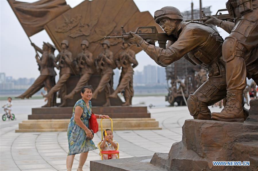 Photo taken on July 31, 2017 shows sculptures marking the 90th anniversary of the founding of the Chinese People's Liberation Army (PLA) at a plaza in Nanchang, east China's Jiangxi Province. The sculpture plaza covering an area of about 16,000 square meters was open to the public on Monday. (Xinhua/Wan Xiang)