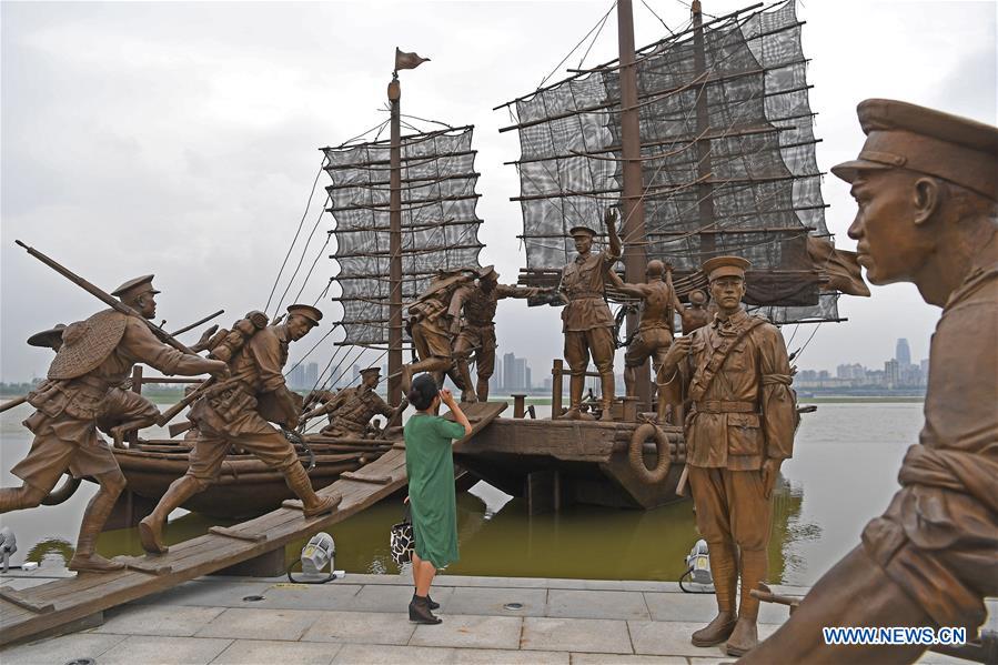 A visitor looks at sculptures marking the 90th anniversary of the founding of the Chinese People's Liberation Army (PLA) at a plaza in Nanchang, east China's Jiangxi Province, July 31, 2017. The sculpture plaza covering an area of about 16,000 square meters was open to the public on Monday. (Xinhua/Wan Xiang)