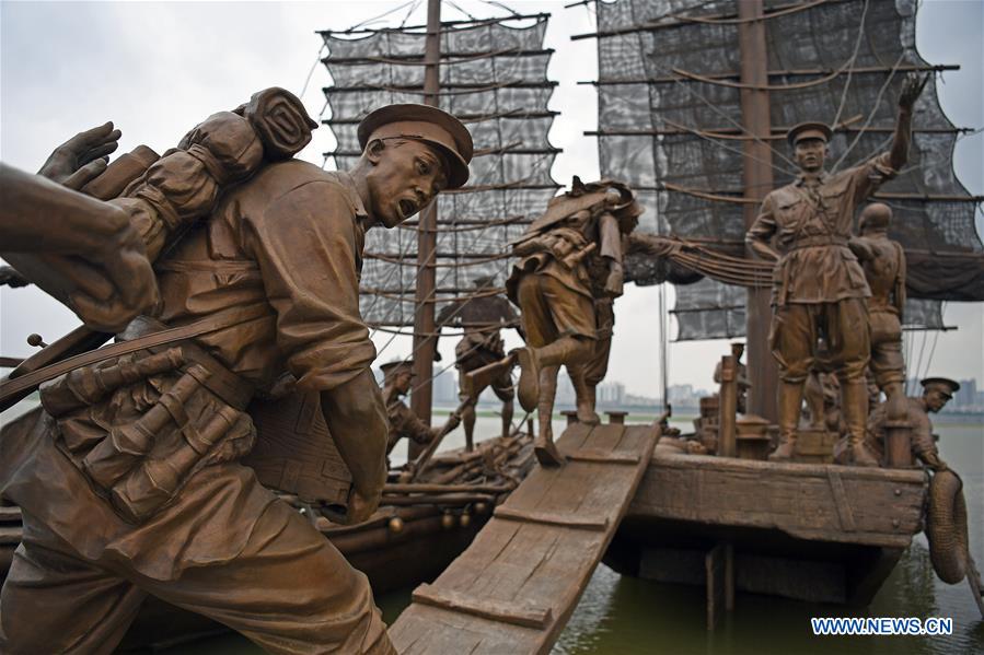 Photo taken on July 31, 2017 shows sculptures marking the 90th anniversary of the founding of the Chinese People's Liberation Army (PLA) at a plaza in Nanchang, east China's Jiangxi Province. The sculpture plaza covering an area of about 16,000 square meters was open to the public on Monday. (Xinhua/Wan Xiang)