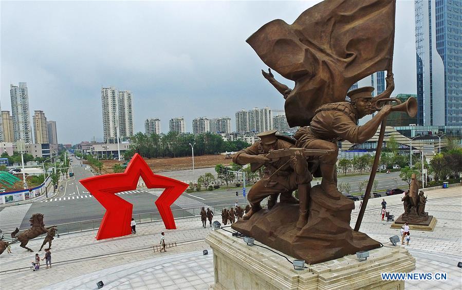 Photo taken on July 31, 2017 shows sculptures marking the 90th anniversary of the founding of the Chinese People's Liberation Army (PLA) at a plaza in Nanchang, east China's Jiangxi Province. The sculpture plaza covering an area of about 16,000 square meters was open to the public on Monday. (Xinhua/Wan Xiang)