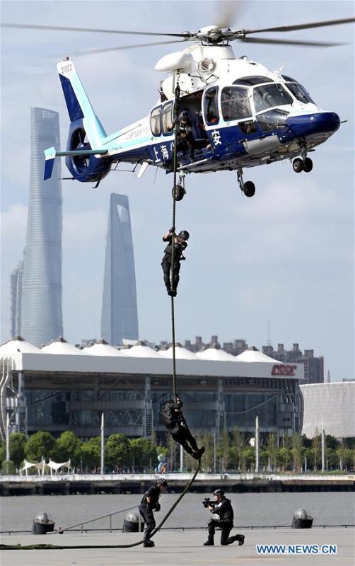 SWAT team members take part in a drill to test their ability to handle emergency situations in east China's Shanghai Municipality, July 31, 2017. (Xinhua/Fan Jun)