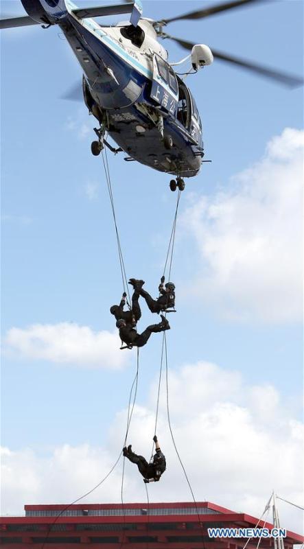 SWAT team members take part in a drill to test their ability to handle emergency situations in east China's Shanghai Municipality, July 31, 2017. (Xinhua/Fan Jun)