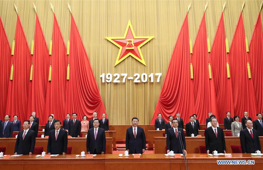 Chinese President Xi Jinping, also general secretary of the Communist Party of China Central Committee and chairman of the Central Military Commission, and other senior leaders Li Keqiang, Zhang Dejiang, Yu Zhengsheng, Liu Yunshan, Wang Qishan and Zhang Gaoli attend a grand gathering in celebration of the 90th founding anniversary of the People's Liberation Army at the Great Hall of the People in Beijing, capital of China, Aug. 1, 2017. (Xinhua/Ju Peng)