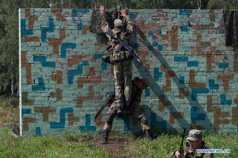 Russian soldiers climb a wall during the "Army Scout Masters" competition of the International Army Games 2017 in Novosibirsk region, Russia, on Aug. 2, 2017. "Army Scout Masters" competition of the International Army Games 2017 kicked off at the Novosibirsk Higher Military Command School on July 30. (Xinhua/Bai Xueqi)