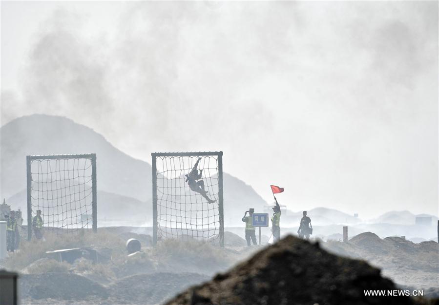 A soldier cilmbs over a fence during the "Safe Environment" competition in Korla of northwest China's Xinjiang Uygur Autonomous Region, August 2, 2017. "Safe Environment" competition of the International Army Games 2017 kicked off in Korla on Wednesday. Teams from China, Russia, Egypt, Iran and Belarus took part in the competition. (Xinhua/Hu Huhu)