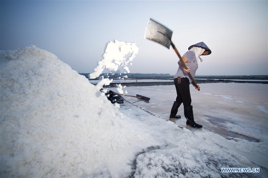 A worker piles up salt during salt farming season at Shanyao saltworks in Quanzhou City, southeast China's Fujian Province, Aug. 6, 2017. Covering an area of more than 6,666 hectares, the Shanyao saltworks have producing salt for more than 200 years. It is still one of the largest in Fujian Province and about 500 workers now work at the saltworks. (Xinhua/Jiang Kehong)