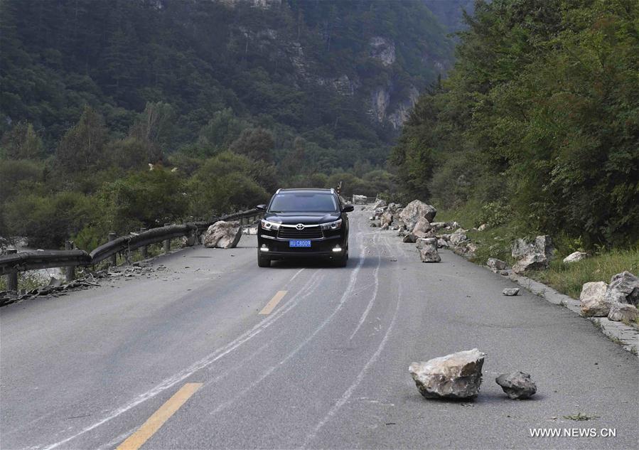 Photo taken on Aug. 9, 2017 shows falling stones in quake-hit Jiuzhaigou County, southwest China's Sichuan Province, Aug. 9, 2017. A 7.0-magnitude earthquake struck Jiuzhaigou, a popular tourist destination, Tuesday night. (Xinhua/Liu Kun)