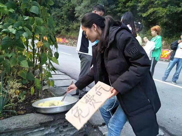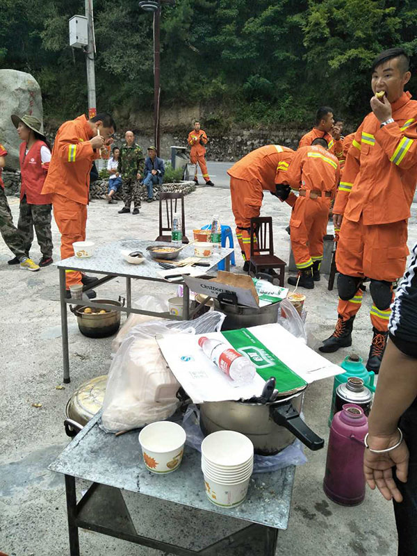 A college student has taken the lead to offer free food to those leaving and entering the magnitude-7.0 earthquake-stricken Jiuzhaigou in Wujiao Village, which sits on an evacuation route out of Jiuzhaigou.