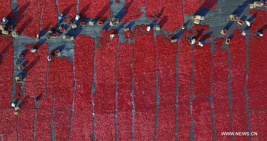 Villagers put tomatoes under the sun to dry them in Hejing County of Mongolian Autonomous Prefecture of Bayingolin, northwest China's Xinjiang Uygur Autonomous Region, Aug. 20, 2017. The prefecture, with more than 20,000 hectares of tomato field, is a producing base for the sun dried tomatoes for the Korean, Australian, UK and USA market. (Xinhua/Que Hure)