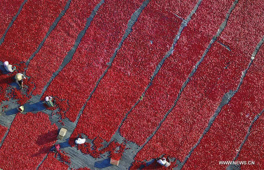 Villagers put tomatoes under the sun to dry them in Hejing County of Mongolian Autonomous Prefecture of Bayingolin, northwest China's Xinjiang Uygur Autonomous Region, Aug. 20, 2017. The prefecture, with more than 20,000 hectares of tomato field, is a producing base for the sun dried tomatoes for the Korean, Australian, UK and USA market. (Xinhua/Que Hure)