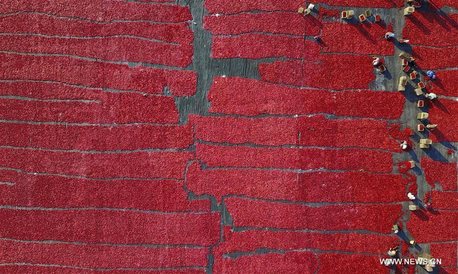 Villagers put tomatoes under the sun to dry them in Hejing County of Mongolian Autonomous Prefecture of Bayingolin, northwest China's Xinjiang Uygur Autonomous Region, Aug. 20, 2017. The prefecture, with more than 20,000 hectares of tomato field, is a producing base for the sun dried tomatoes for the Korean, Australian, UK and USA market. (Xinhua/Que Hure)