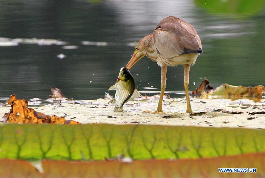 A waterfowl catches a fish at a pond in Yuyuantan park in Beijing, capital of China, Aug. 31, 2017. (Xinhua/Wang Xibao)