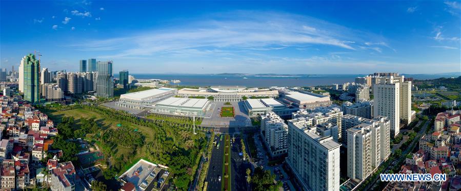 Photo taken on Aug. 26, 2017 show the Xiamen International Conference and Exhibition Center and the scene of its nearby area in Xiamen, southeast China's Fujian Province. The 9th BRICS Summit will be held in Xiamen on Sept. 3-5. (Xinhua/Jiang Kehong)