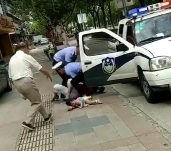 The video of a woman being wrestled to the ground in a Shanghai street by local police officers, and her toddler falling to the ground, has gone viral on Chinese social media. [Photo: weibo.com]