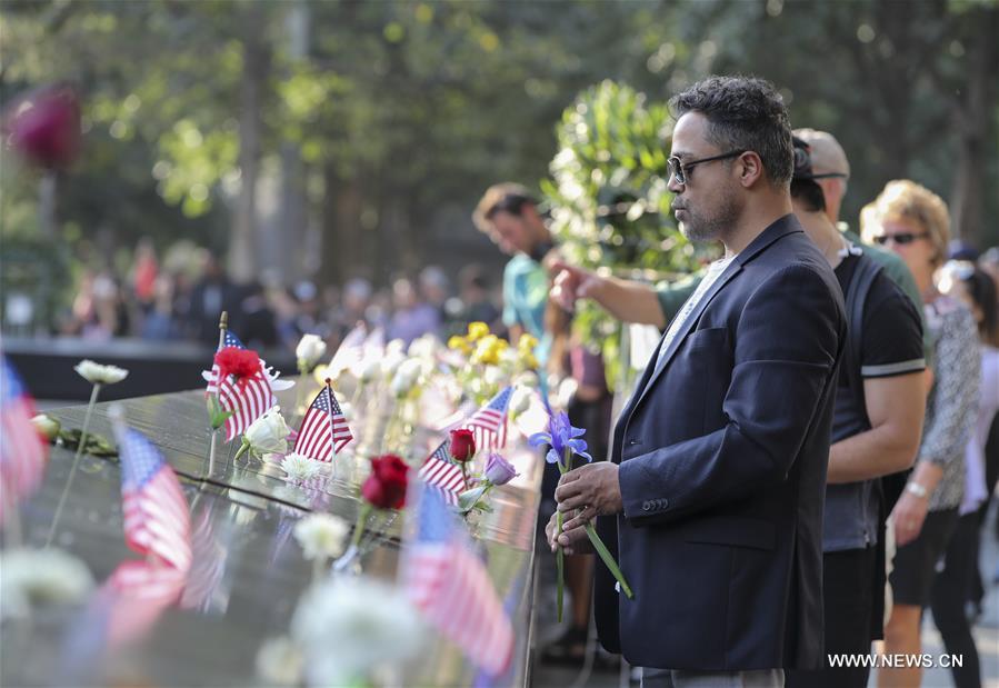 A man holding flowers stands beside plates on which the names of 9/11 victims were inscribed around the South Pool at the National September 11 Memorial and Museum in New York, the United States, on Sept. 11, 2017. People paid their tributes here on Monday to mourn the victims of the 9/11 terror attacks which happened 16 years ago and claimed thousands of lives. (Xinhua/Wang Ying)