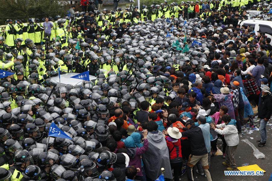 Protesters clash with the police during a demonstration against the Terminal High Altitude Area Defense (THAAD) in Seongju, South Korea, on Sept. 7, 2017. Seoul's defense ministry said the remaining THAAD elements and other construction equipment would be delivered to the former golf course at Soseong-ri village in Seongju county, North Gyeongsang province within Thursday, and thousands of policemen violently dispersed peace activists and residents living near the site of the THAAD missile defense system. (Xinhua/Yao Qilin)