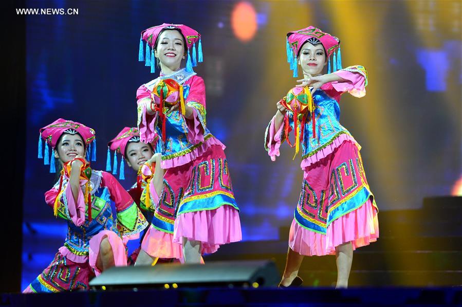Actresses perform during a gala of the 19th Nanning international folk song art festival in Nanning, capital of south China's Guangxi Zhuang Autonomous Region, Sept. 12, 2017. (Xinhua/Li Xuanli)