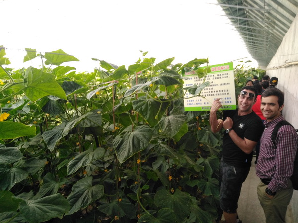 Journalists visit a cucumber greenhouse in Zongzhai Town, Gansu province on September 17. Photo: Kimeng Hilton