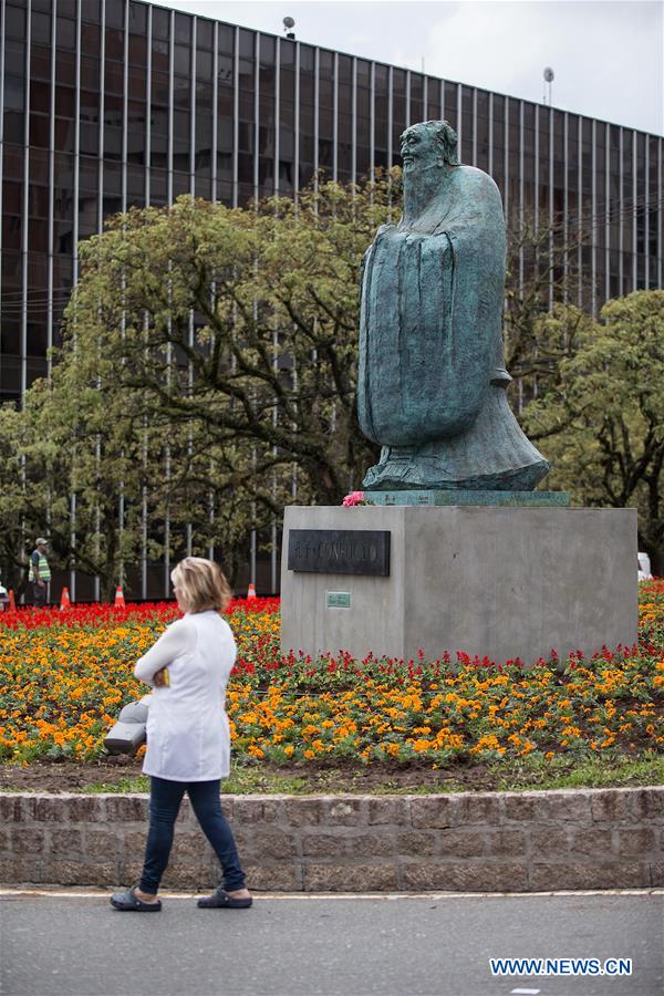 A woman walks past the newly-unveiled Confucius bronze statue at China Plaza in Curitiba, Brazil, on Sept. 30, 2017. An imposing bronze statue of ancient Chinese philosopher Confucius was unveiled on Saturday in Curitiba, capital of Brazil's southern state of Parana, as a gift from the Chinese government. (Xinhua/Li Ming)