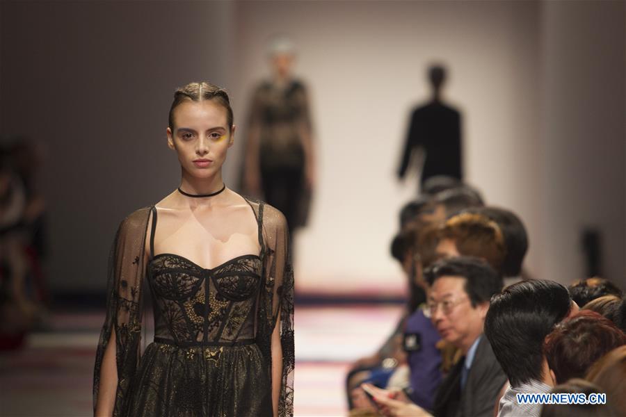 A model presents a creation during the Shanghai Fashion Week Spring/Summer 2018 in Shanghai, east China, Oct. 11, 2017. Shanghai Fashion Week kicked off here on Wednesday. (Xinhua/Du Xiaoyi)