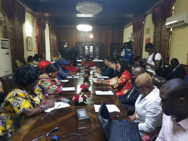 Sierra Leone’s First Lady, Mrs. Sia Nyama Koroma, Chinese Ambassador, Wu Peng and other dignitaries present displaying the donated consignment