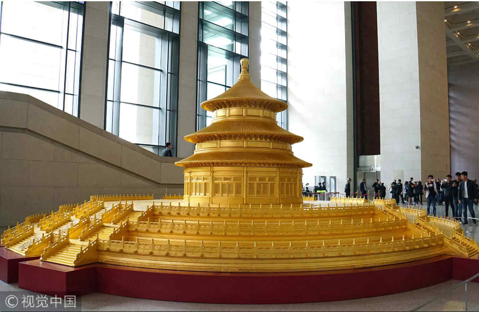 A model of "The Hall of Prayer for Good Harvest" of "The Temple of Heaven" that is made of teak and covered in gold foil is put on display at the China National Museum in Beijing, on October 17, 2017. The model is 3.8 meters high, with a diameter of 9 meters and weighs 5 tonnes.