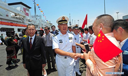The Chinese naval hospital ship Peace Ark Task Group Commander Guan Bailin (C) shakes hands with a representative of overseas Chinese in Luanda, Angola, on Oct. 19, 2017. The Chinese naval hospital ship Peace Ark has arrived in Luanda on Thursday morning, on an eight-day mission to deliver free medical services to the local people. (Xinhua/Jiang Shan)