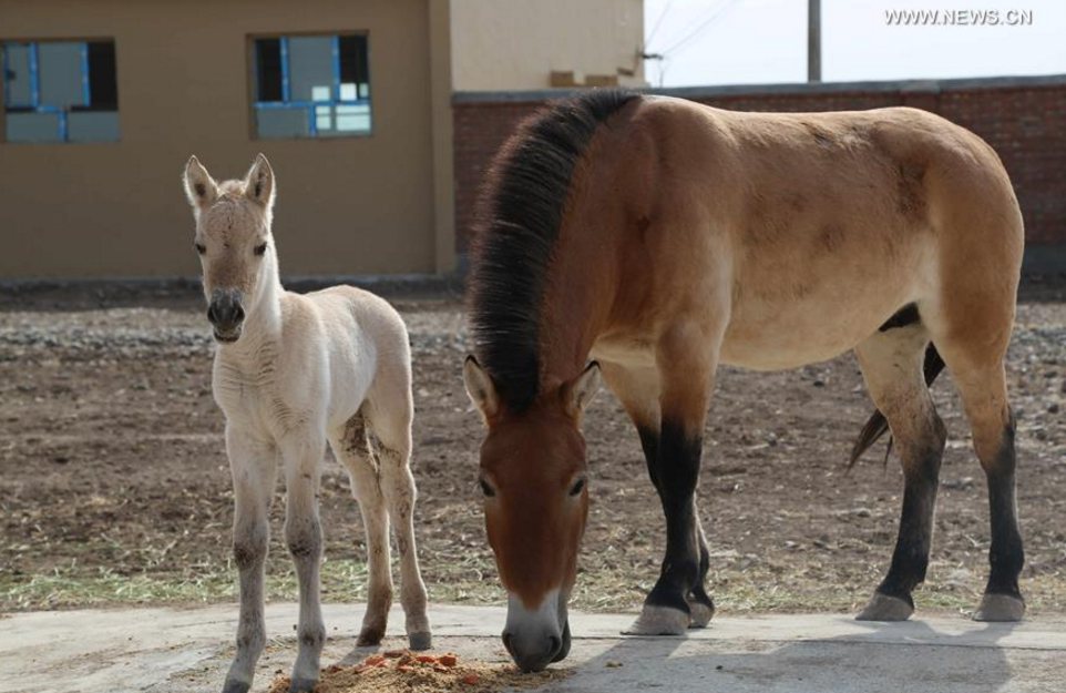 Female Przewalski's horse "Snow White" (L) stands with her mother at a wild horse breeding center in northwest China's Xinjiang Uygur Autonomous Region, Oct. 19, 2017. Two foals of rare Przewalski's horse were born here earlier in October, bringing the total number of the once-extinct wild horses to 379 in the region. Przewalski's horses historically lived on grasslands that are now part of China's Xinjiang Uygur Autonomous Region and Mongolia. There are currently about 2,000 Przewalski's horses in the world, even less than the number of giant pandas. (Xinhua)