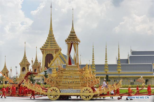 The Great Victory Chariot carrying the royal urn of Thailand's late King Bhumibol Adulyadej is pictured ahead of the royal cremation ceremony in Bangkok, Thailand, Oct. 26, 2017. [Photo: Xinhua]