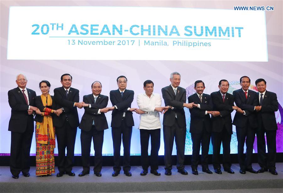 Chinese Premier Li Keqiang (5th L) and leaders of the Association of Southeast Asian Nations (ASEAN) member countries pose for group photos before the 20th China-ASEAN (10+1) leaders' meeting in Manila, the Philippines, Nov. 13, 2017. (Xinhua/Liu Weibing)