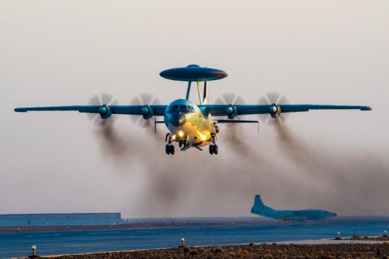 A KJ-500 airborne early warning (AEW) aircraft takes off from the runway during the "Red Sword-2017" systemic confrontation training exercise held by the Chinese PLA Air Force in deep desert in late November, 2017. (Photo/eng.chinamil.com.cn)