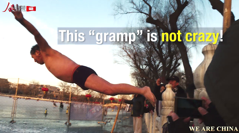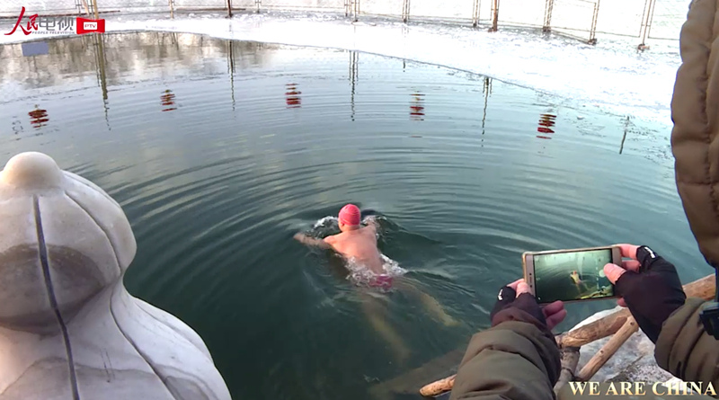 “Jump!” shouted a “gramp” in his swim trunks to boost his own courage before diving into a a hole in a frozen lake. He’s one of the winter swimmers who come to Shichahai, Beijing, to enjoy swimming in the frozen lake every day during winter.