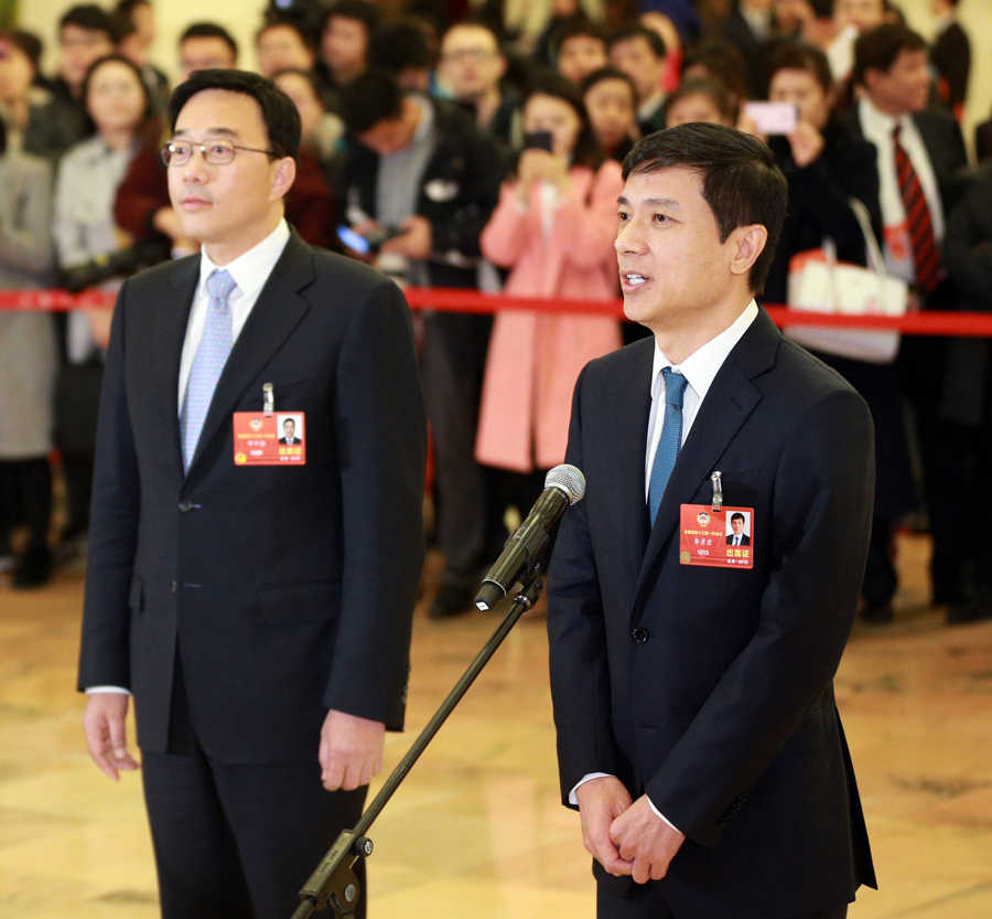 Baidu CEO Li Yanhong, also known as Robin Li (right), and Deng Zhonghan, chief scientist of chipmaker Vimicro, are interviewed as members of the 13th National Committee of the CPPCC on the sidelines of the closing of the first session at the Great Hall of the People in Beijing on Thursday. [Provided to China Daily]