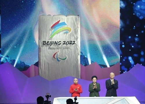 The emblem of Beijing 2022 Paralympic Winter Games is unveiled during the emblem launch ceremony for the Beijing 2022 Olympic and Paralympic Winter Games in Beijing, capital of China, Dec. 15, 2017. (Photo by People’s Daily Online)