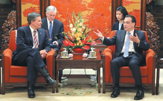 Premier Li Keqiang talks with visiting US Senator Steve Daines in Beijing on Tuesday. Daines was leading a congressional delegation to China. WU ZHIYI / CHINA DAILY