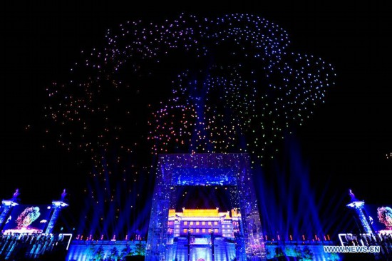 Over 1,300 drones give a show above the ancient city wall at a light show held in Xi'an, capital of northwest China's Shaanxi Province, May 1, 2018. Lighting technology, modern art and traditional culture were ideally blended together in the light show. (Xinhua/Liu Xiao)