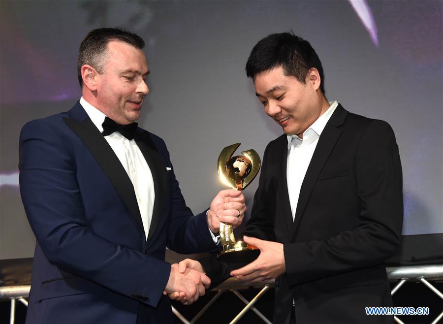 China's former world number one Ding Junhui (R) is awarded the trophy by Jason Ferguson, chairman of World Professional Billiards and Snooker Association (WPBSA), at the annual World Snooker Awards ceremony at the Dorchester Hotel in central London, Britain on May 10, 2018. Ding was inducted into the world snooker Hall of Fame here on Thursday. (Xinhua/Benjamin Mole)