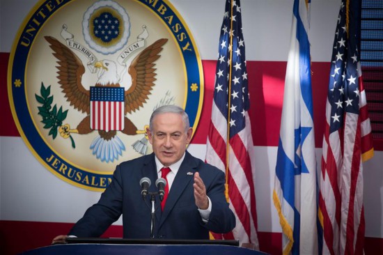 Israeli Prime Minister Benjamin Netanyahu speaks during the inauguration ceremony of the new U.S. embassy in Jerusalem, on May 14, 2018. The inauguration ceremony of the new U.S. embassy in Jerusalem started on Monday afternoon, as Israeli and U.S. officials gathered in the city amidst deadly clashes in the Gaza Strip. (Xinhua/JINI)