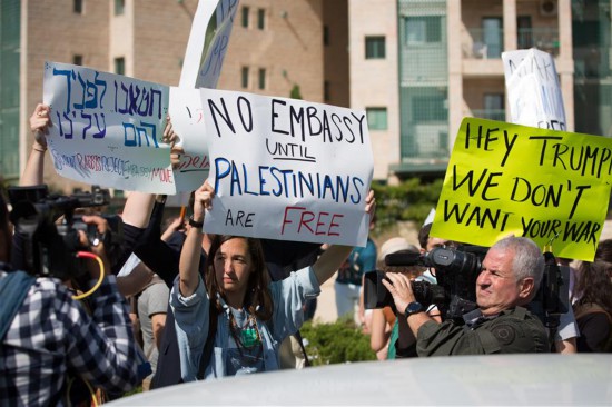 People protest against the new U.S. embassy in Jerusalem, on May 14, 2018. The inauguration ceremony of the new U.S. embassy in Jerusalem started on Monday afternoon, as Israeli and U.S. officials gathered in the city amidst deadly clashes in the Gaza Strip. (Xinhua/Guo Yu)