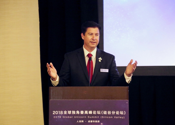David Haubert, mayor of Dublin, California, delivers a speech at the 2018 Global Unicorn Enterprise Forum. Photo by Zhang Jiexian from People’s Daily Online