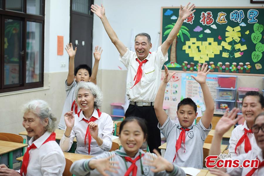 Photo taken on May 28, 2018 shows five elderly people, 73 years old on average, put on white shirts and red scarfs to pose for an awareness event in the run up to Children’s Day at an elementary school in Nanjing, East China’s Jiangsu Province. Organizer said the event aimed to inspire more people to take care of elderly people. (Photo: China News Service/Yang Bo)