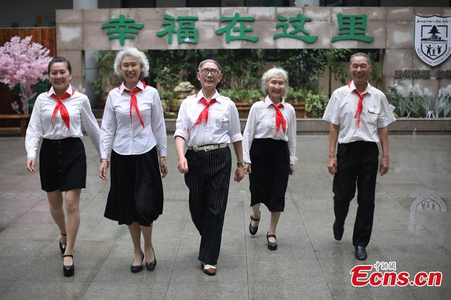 Photo taken on May 28, 2018 shows five elderly people, 73 years old on average, put on white shirts and red scarfs to pose for an awareness event in the run up to Children’s Day at an elementary school in Nanjing, East China’s Jiangsu Province. Organizer said the event aimed to inspire more people to take care of elderly people. (Photo: China News Service/Yang Bo)