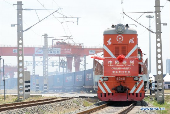 A freight train loaded with imported vehicles arrives at the container terminal in Xi'an of northwest China's Shaanxi Province, June 13, 2018. Departed from Ghent, Belgium, the train took 16 days to transport a total of 160 Volvo vehicles, covering a distance of more than 10,000 kms. (Xinhua/Li Yibo)